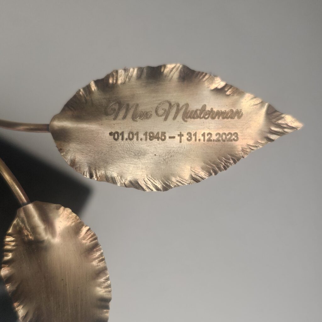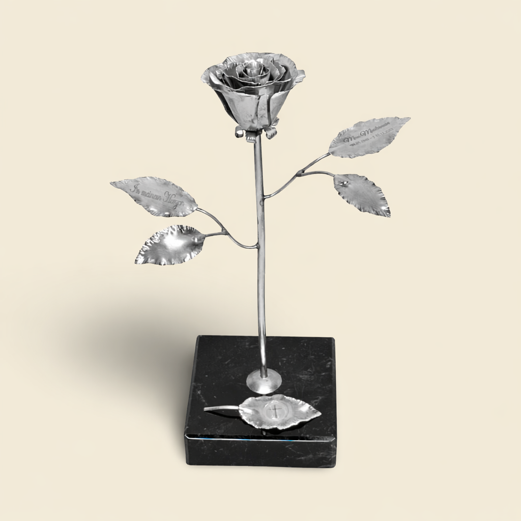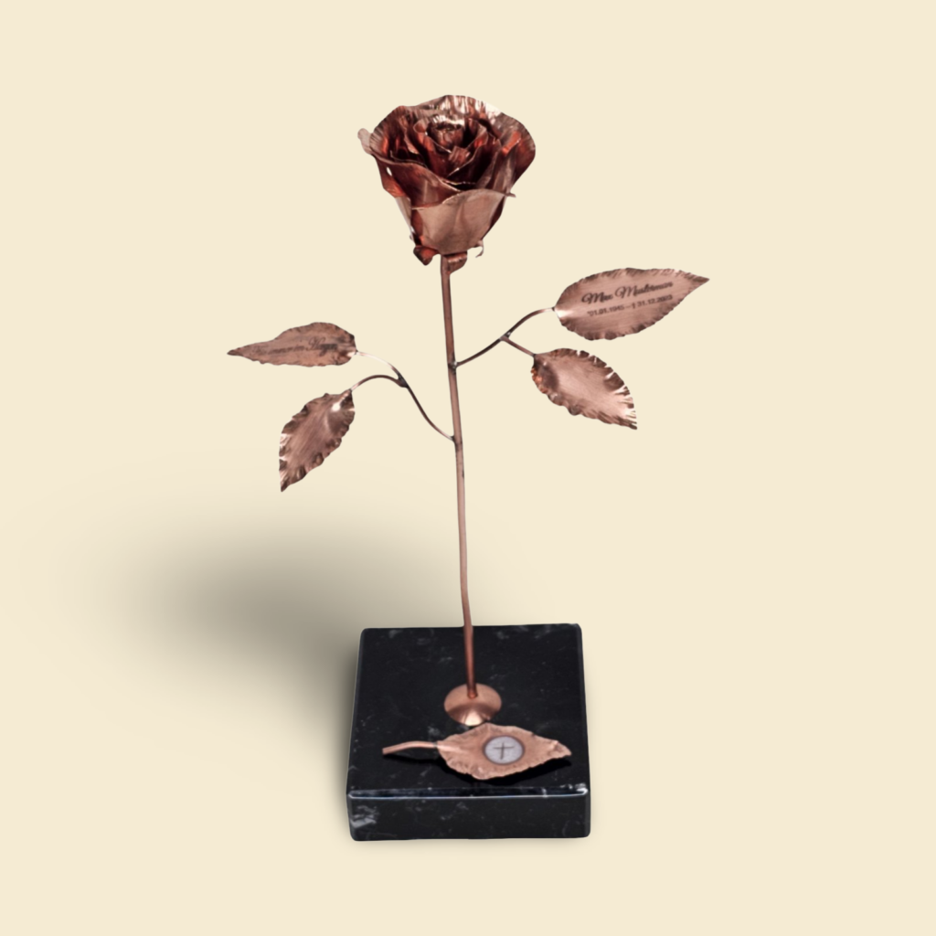 Die Ewige Rose ist ein persönliches Andenken an einen geliebten Menschen, der nicht mehr da ist – und doch Teil des eigenen Lebens bleibt. Sie wird von Hand aus Messing, Kupfer oder Silber (935) gefertigt und steht auf einem echten Marmorsockel. Stabil, ruhig, dauerhaft – so wie die Verbindung, die nicht endet. Im Credo kann etwas ganz Persönliches bewahrt werden: Haare oder Asche, eingebettet in Epoxidharz. Behutsam verarbeitet, sichtbar und geschützt. Die Hintergrundfarbe wird individuell gewählt – abgestimmt auf den Menschen, an den erinnert wird. Auf den Blättern der Rose finden Name, Geburts- und Todestag ihren Platz. Ein weiteres Blatt kann einen Spruch, ein Zitat oder eigene Worte tragen. Worte, die trösten. Worte, die Nähe schaffen. So entsteht kein dekoratives Objekt, sondern ein stilles Erinnerungsstück. Etwas, das man zu Hause hat. Etwas, das man ansehen, berühren, bei sich wissen kann. Die Ewige Rose ist ein Unikat – gefertigt mit Zeit, Sorgfalt und Respekt. Für einen Menschen, der fehlt. Und doch weiterlebt – in der Erinnerung, im Herzen, und an einem festen Ort.